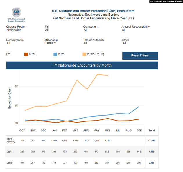 ABD Gümrük ve Sınır Koruma Dairesi, Ekim ayında başlayan mali yıl takviminin gösterdiği verileri paylaştı. Buna göre 2019 yılı Ekim ayında başlayan 2020 mali yılında 2 bin 580, 2020 Ekim ayında başlayan 2021 mali yılında 4 bin 989 ve 2021 Ekim ayında başlayan 2022 mali yılının bu yıl Temmuz ayına kadar olan sürede de 14 bin 396 Türk vatandaşı Meksika sınırından ABD’ye geçti.