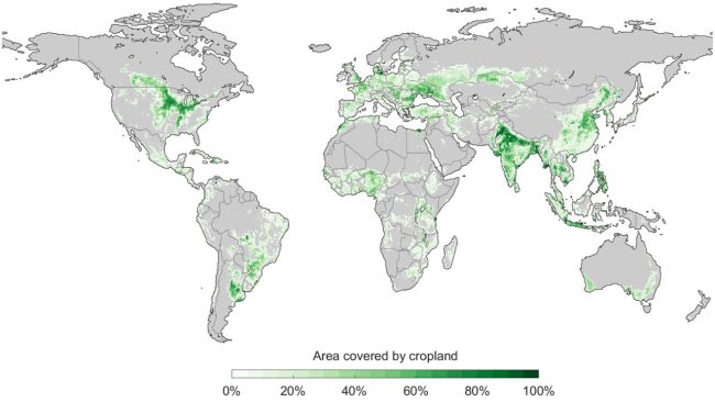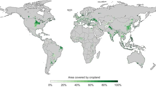 An itibarıyla tarım yapılan arazilere baktığımızda, bunların Avrupa, ABD ve Asya'nın doğu taraflarında yoğunlaştığını görüyoruz. Güney Amerika ve Afrika'daki durum da küçümsenecek türden değil. Tarım için tatlı su kaynaklarının %70 gibi çok ciddi bir bölümünün kullanıldığını açıklayan bilim insanları, yukarıdaki haritanın aşağıdaki hale getirilmesinin gezegenimizin geleceği için kritik önem arz ettiğini belirtiyorlar.