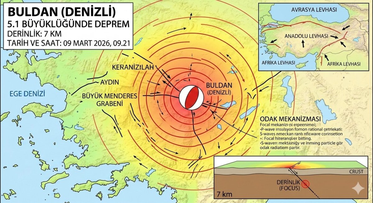 Denizli'nin Buldan ilçesinde 9 Mart 2026 09:21'de 5.1 büyüklüğünde deprem meydana geldi. Yerin 7 kilometre derinliğinde olan deprem, Aydın ve ilçelerinde de hissedildi.