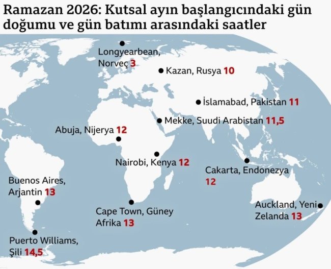 Ramazan ayı, dünyanın kuzeyinde ya da güneyinde olmanıza göre 17 Şubat Salı veya 18 Şubat Çarşamba günü başlıyor. En uzun Ramazan orucu, 14,5 saatle dünyanın en güneyindeki şehir olarak kabul edilen Puerto Williams'ta (Şili) tutulacak. En kısa oruç ise Ramazan ayının başında Nuuk, Grönland'ta tutulacak.