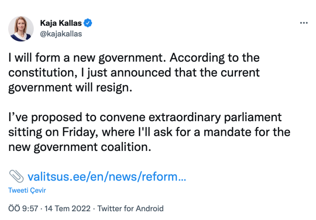 Estonya Başbakanı Kaja Kallas istifa ettiğini açıkladı. Kallas, sosyal medya hesabından yaptığı açıklamada yeni bir koalisyon hükümetinin kurulması için istifa ettiğini duyurdu.