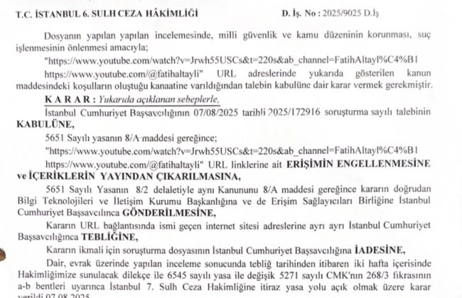 6. Sulh Ceza Hakimliği tarafından verilen erişim engeli kararı, 7 Ağustos 2025 (bugün) itibarıyla internet servis sağlayıcılarına (İSS) iletildi. Karar metnine göre, İstanbul 6. Sulh Ceza Hâkimliği, engelleme talebini "milli güvenlik ve kamu düzeninin korunması, suç işlenmesinin önlenmesi amacıyla" kabul ettiğini belirtti. Karar, kamuoyunda "internet yasası" olarak bilinen 5651 Sayılı Yasa'nın 8/A maddesine dayandırıldı. Karar, gereğinin yapılması için Bilgi Teknolojileri ve İletişim Kurumu (BTK) ile Erişim Sağlayıcıları Birliği'ne gönderildi.