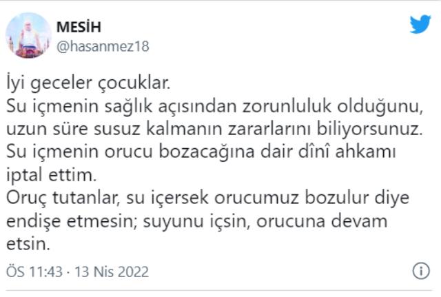 "Su içmenin orucu bozacağına dair dînî ahkamı iptal ettim." diyen Mezarcı Twitter'dan şu paylaşımları yaptı: "İyi geceler çocuklar. Su içmenin sağlık açısından zorunluluk olduğunu, uzun süre susuz kalmanın zararlarını biliyorsunuz. Su içmenin orucu bozacağına dair dînî ahkamı iptal ettim. Oruç tutanlar, su içersek orucumuz bozulur diye endişe etmesin; suyunu içsin, orucuna devam etsin."