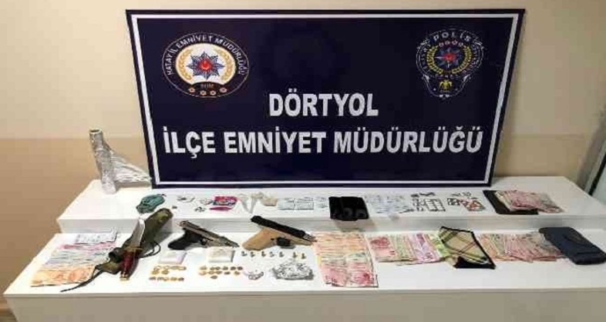 Hatay'ın Çaylı Mahallesi'ndeki bir evde ve evin müştemilatında yapılan aramada, 2 ruhsatsız tabanca, 7 fişek, 1,8 gram eroin, 0,7 gram esrar, 2,1 gram metamfetamin, 73 adet uyuşturucu hap ile uyuşturucudan elde edildiği düşünülen 8 bin 215 lira, 15 çeyrek ve 8 yarım altın ele geçirildi.