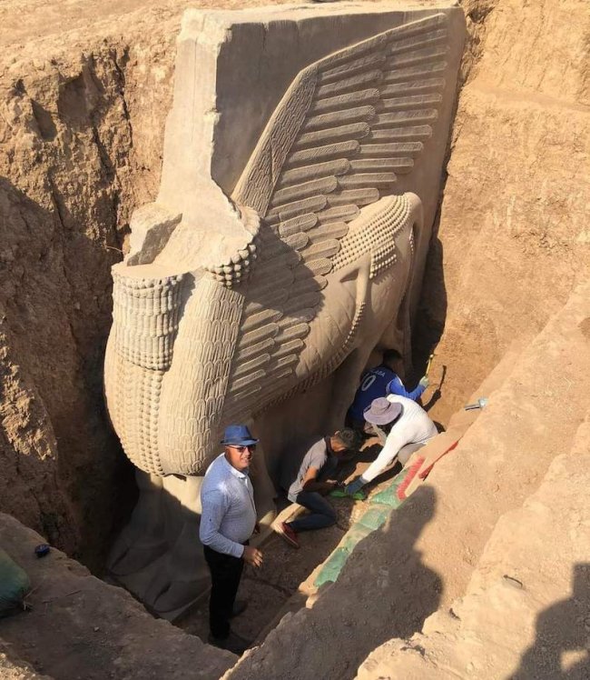 Irak'ta ilk defa 1992 yılında Iraklı bir arkeolog ekibi tarafından keşfedilen ve sonrasında korumak için yeniden gömülen Lamassu heykelinin gövdesi ortaya çıkarıldı. Heykelin baş kısmı 1995'te kaçırılmış ancak sonrasında kurtarılarak halihazırda bulunduğu Badat'taki Irak Ulusal Müzesi'ne yerleştirilmişti.