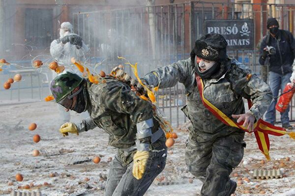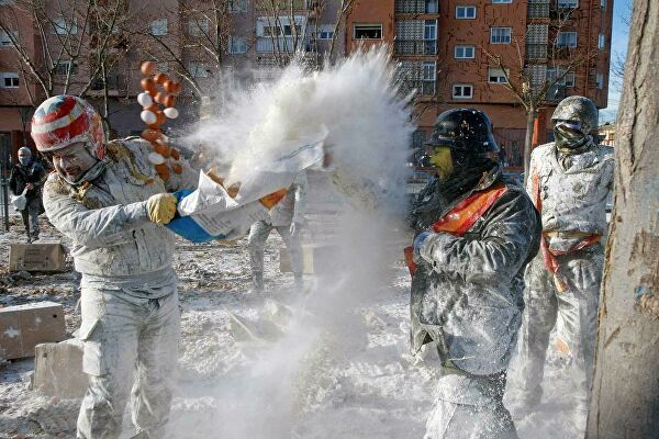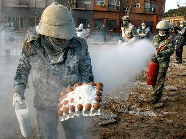 İspanya'da 200 senedir gerçekleştirilen "Un Savaşları Festivali" bu sene de yapıldı. Festival katılımcıları askeri kıyafetler giyerek belediye binasına un, yumurta ve havai fişek ile sahte bir darbe düzenliyorlar.
