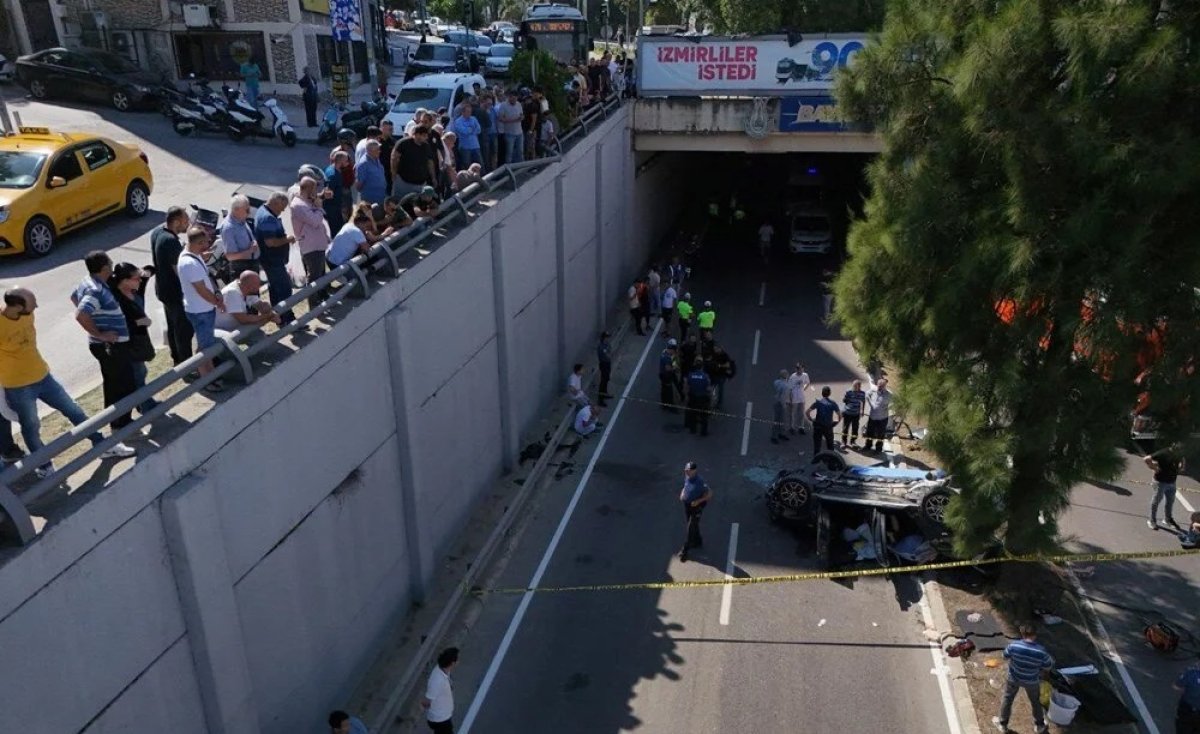 İzmir’in Konak ilçesinde bir otomobil 6 metre yükseklikten alt geçide düştü. Kazada 3 kişi yaşamını yitirdi, 2 kişi de ağır yaralandı.