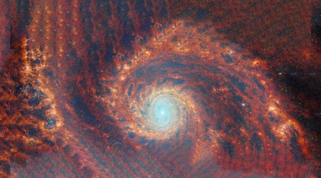 Teleskobun NIRCam ve MIRI aygıtlarıyla kaydedilen çarpıcı görüntüde sarmal kollar arasındaki gizli özellikler ve muazzam ayrıntılar yer alıyor. Galaksi, girdap halinde dönen bir suyu anımsatan yapısı nedeniyle Girdap diye adlandırılıyor.