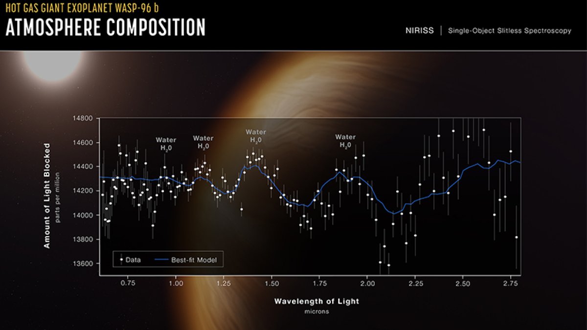 NASA'nın James Webb Uzay Teleskobu, Güneş benzeri uzak bir yıldızın yörüngesinde dönen sıcak, kabarık gaz devi olan WASP-96 isimli bir gezegeni çevreleyen atmosferde, bulutların ve pusların kanıtlarıyla birlikte var olan suyun belirgin bir fotoğrafını yakaladı. Yani gezegende su molekülleri bulundu.