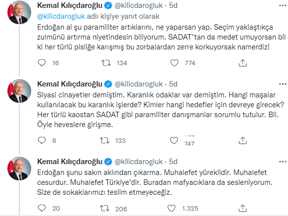 CHP lideri Kılıçdaroğlu devamında da, "Biz Cumhuriyet Halk Partisiyiz, biz Kuvayı Milliyeciyiz, biz SADAT'çılardan korkacak kişiler değiliz. Korkanlar kapılarını açmayanlardır. Buraya geldik kendilerinden bilgi almak istedik ama korkularından yuvalarına sığındılar o yuva onları kurtarmaz. Biz bu ülkede gerçek anlamda demokrasiyi getirinceye kadar mücadelemizi sürdüreceğiz." dedi. CHP lideri Kılıdçaroğlu, "Korkunun ecele faydası yok. Türkiye'de hiç kimse unutmasın bu ülkede Cumhuriyet Halk Partisi var." dedi.
