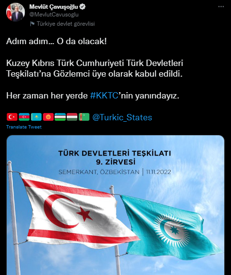 Dışişleri Bakanı Mevlüt Çavuşoğlu Twitter paylaşımında, "Kuzey Kıbrıs Türk Cumhuriyeti, Türk Devletleri Teşkilatı’na gözlemci üye olarak kabul edildi." ifadesini kullandı. Çavuşoğlu, her zaman KKTC'nin yanında olduklarını belirtti. Bakan Çavuşoğlu, Türk Devletleri Teşkilatı 9. Zirvesi'ne ilişkin fotoğraf paylaştı.