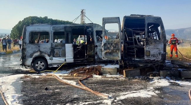 Milas-Muğla kara yolu Menteş Kavşağı'nda, iki minibüsün çarpışması sonucu yaralanan 4'ü ağır 14 kişi Milas Devlet Hastanesi'ne kaldırıldı. Kazanın ardından alev alan araçlar, yanmaya başladı ve kullanılamaz hale geldi.