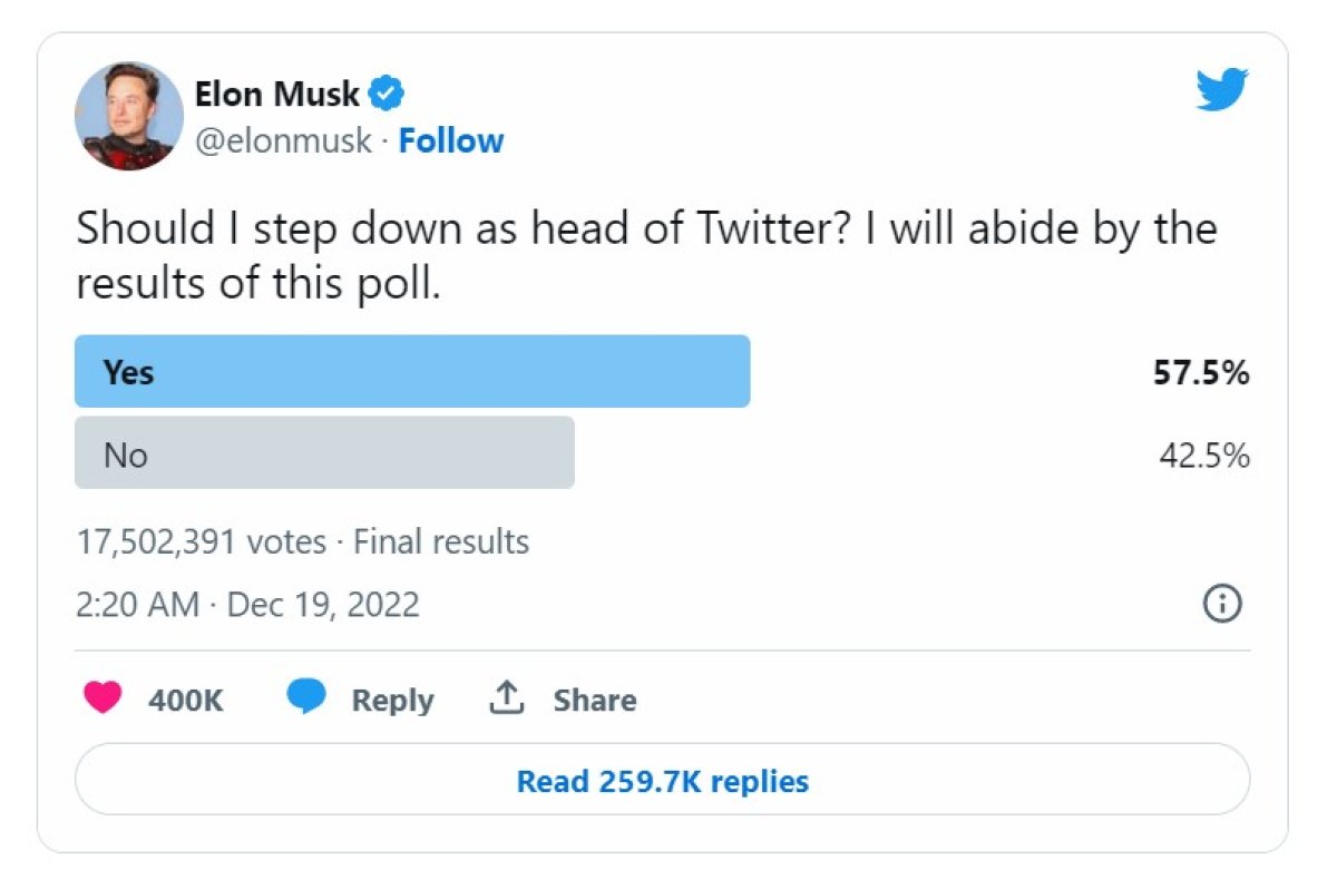 Musk, "Twitter'ın başındaki kişi olarak istifa etmeli miyim? Bu anketin sonuçlarına uyacağım." paylaşımında bulundu. Musk'ın anketinde 17 milyon 500 binden fazla kişi oy kullandı. Anket sonuçlarına göre, katılımcıların yüzde 57,5'i Musk'ın ayrılması, 42,5'i ise devam etmesi yönünde tercihini ortaya koydu.
