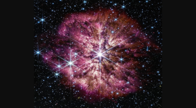 NASA, James Webb Uzay Teleskobu'nun (JWST) çektiği, patlamak üzere olan dev bir yıldızın çarpıcı görüntüsünü paylaştı.Yayınlanan görüntü yaklaşık 15 bin ışık yılı uzaklıktaki WR 124 adlı bir Wolf-Rayet yıldızını gösteriyor. Bu da bu yıldızdan gelen ışığın JWST'nin Yakın Kızılötesi Kamerasındaki dedektörlere denk gelene kadar yaklaşık 15 bin yıldır uzayda seyahat ettiği anlamına geliyor.