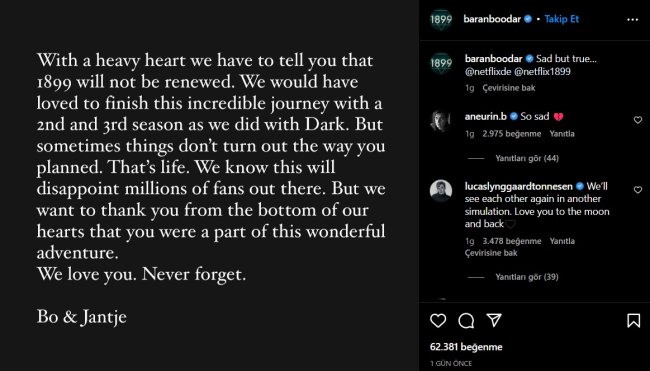 “Üzülerek sizlere 1899’un yenilenmeyeceğini söylemek zorundayız. Bu inanılmaz yolculuğu Dark’ta yaptığımız gibi ikinci ve üçüncü sezonlara taşıyarak bitirmeyi çok isterdik. Ancak bazen işler planlandığı gibi gitmez. Hayat bu. Bu haberin milyonlarca hayranı hayal kırıklığına uğratacağını biliyoruz. Bu harika maceranın bir parçası olduğunuz için sizlere kalbimizin derinliklerinden teşekkür etmek istiyoruz. Sizleri seviyoruz. Bunu asla unutmayın.”