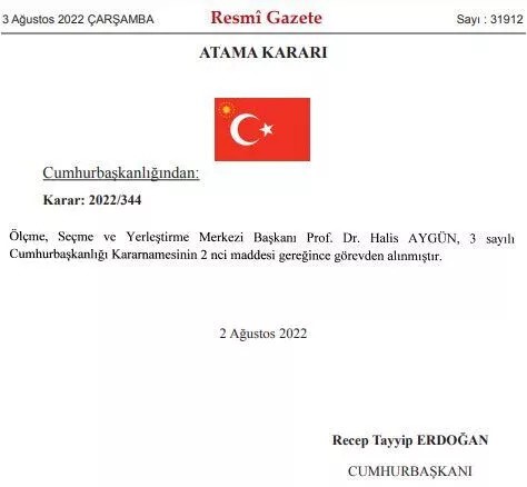 Resmi Gazete'de yayımlanan kararda "Ölçme Seçme ve Yerleştirme Merkezi Başkanı Prof. Dr. Halis Aygün 3 sayılı Cumhurbaşkanlığı Kararnamesi'nin 2'nci maddesi gereğince görevden alınmıştır." denildi.