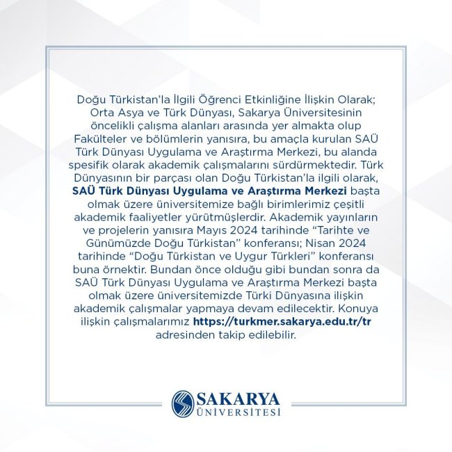 "Doğu Türkistan'la İlgili Öğrenci Etkinliğine İlişkin Olarak; Orta Asya ve Türk Dünyası, Sakarya Üniversitesinin Öncelikli çalışma alanları arasında yer almakta olup Fakülteler ve bölümlerin yanısıra, bu amaçla kurulan SAÜ Türk Dünyası Uygulama ve Araştırma Merkezi, bu alanda spesifik olarak akademik çalışmalarını sürdürmektedir. Türk Dünyasının bir parçası olan Doğu Türkistan'la ilgili olarak, SAÜ Türk Dünyası Uygulama ve Araştırma Merkezi başta olmak üzere üniversitemize bağlı birimlerimiz çeşitli akademik faaliyetler yürütmüşlerdir. Akademik yayınların ve projelerin yanısıra Mayıs 2024 tarihinde "Tarihte ve Günümüzde Doğu Türkistan" konferansı; Nisan 2024 tarihinde "Doğu Türkistan ve Uygur Türkleri" konferansı buna örnektir. Bundan önce olduğu gibi bundan sonra da SAÜ Türk Dünyası Uygulama ve Araştırma Merkezi başta olmak üzere üniversitemizde Türki Dünyasına ilişkin akademik çalışmalar yapmaya devam edilecektir. Konuya ilişkin çalışmalarımız https://turkmer.sakarya.edu.tr/tr adresinden takip edilebilir."