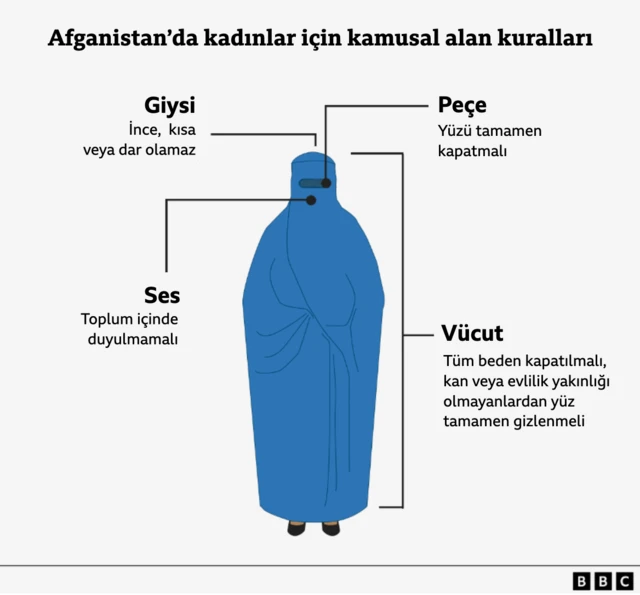 Yeni yasa, kadınların seslerinin toplum içinde duyulmasını “ahlaksızlık" olarak tanımlıyor. Söz konusu madde, "Yetişkin bir kadın zorunlu olarak evinden ayrıldığında sesini, yüzünü ve vücudunu gizlemek zorundadır." ifadesini içeriyor. Aşırılıkçı bu toplumsal kurallar 2022 yılından bu yana ülkede kararname ile uygulanıyordu ancak son yasa ile resmiyet kazandı. Taliban toplumsal ahlak yasalarına uymayan 10 binden fazla kişinin şu ana kadar gözaltına aldığını açıklıyor. Yasa kadınların yüzlerini ve bedenlerini, “erkekleri günaha ve kötülüğe sürüklememek için" nasıl tamamen örtmeleri gerektiğini de tanımlıyor: