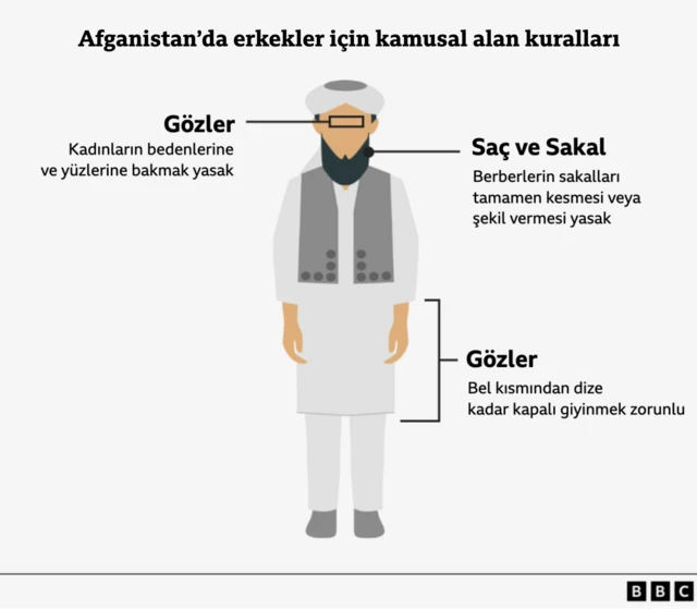 Erkeklerin kadınların bedenlerine ve yüzlerine bakmaları da yasaktır ve aynı şey yetişkin kadınların erkeklere bakması için de geçerlidir. Erkeklerin de evlerinin dışındayken göbekten diz altına kadar, vücutlarını örtmeleri gerekiyor. Bu vücut kısımları "avret" sayılıyor. Erkeklerin saçlarına şeriat yasalarına aykırı bir şekil vermesi de yasaklanıyor. Taliban, berberlerin sakal tıraşı veya sakal düzeltmesi yapmasını da yasakladı. Yeni kurallarla erkeklerin sakallarını yumruk uzunluğunda uzatması zorunlu kılınıyor ve kravat takmak da yasaklanıyor. Yasa kadınların tek başlarına taksiye binmesini ve erkeklerle yan yana araçta oturmasını da yasaklıyor.