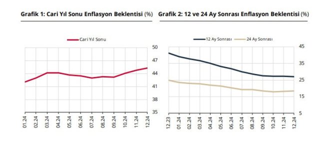 Türkiye Cumhuriyet Merkez Bankası'nın (TCMB) Aralık ayı Piyasa Katılımcıları Anketi'ne göre, yıl sonu enflasyon beklentisi %45,28; 12 ay sonrası yıllık enflasyon beklentisi ise %27,07 oldu. Yıl sonu dolar/TL beklentisi 35,30 TL; 12 ay sonrası dolar/TL beklentisi ise 43,23 TL oldu.