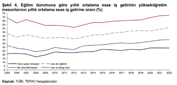 Eğitim seviyeleri arasındaki gelir farklarına odaklanıldığında, yükseköğretim mezunlarının diğer eğitim düzeylerine göre gelir kaybına uğradığı ortaya çıkıyor. TEPAV'ın analizine göre, 2012'de yükseköğretim mezunlarının ortalama geliri, lise mezunlarından yüzde 77 daha fazlayken, bu fark 2022'de yüzde 38'e düşmüştür. Bu durum, yükseköğretime devam etmenin motivasyonunu sorgulatıyor.
