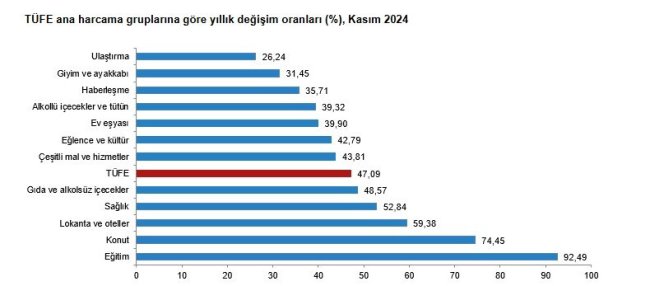Türkiye İstatistik Kurumu (TÜİK), Kasım ayı enflasyon rakamlarını açıkladı. Tüketici Fiyat Endeksi, Kasım'da aylık bazda %2,24 olurken yıllık bazda %47,09'a geriledi. TÜFE'deki değişim 2024 yılı kasım ayında bir önceki aya göre %2,24, bir önceki yılın Aralık ayına göre %42,91, bir önceki yılın aynı ayına göre %47,09 ve on iki aylık ortalamalara göre %60,45 olarak gerçekleşti. Bir önceki yılın aynı ayına göre en az artış gösteren ana grup %26,24 ile ulaştırma oldu. Buna karşılık, bir önceki yılın aynı ayına göre artışın en yüksek olduğu ana grup ise %92,49 ile eğitim oldu.