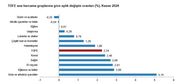 Ana harcama grupları itibarıyla 2024 yılı kasım ayında bir önceki aya göre en çok azalan ana grup %-0,25 ile giyim ve ayakkabı oldu. Buna karşılık, 2024 yılı kasım ayında bir önceki aya göre artışın en yüksek olduğu ana grup ise %5,10 ile gıda ve alkolsüz içecekler oldu. Kasım ayı itibarıyla, 27 temel başlığın endeksinde düşüş gerçekleşirken, 10 temel başlığın endeksinde değişim olmadı. 106 temel başlığın endeksinde ise artış gerçekleşti.