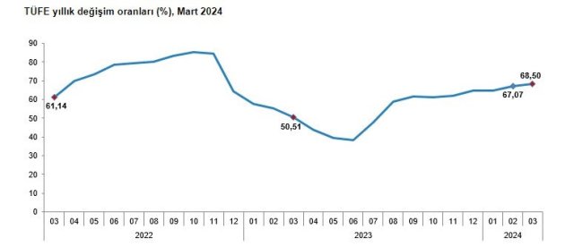 Türkiye İstatistik Kurumu (TÜİK) Mart ayı enflasyon verileri açıkladı. Enflasyon Mart ayında aylık bazda %3,16 artış kaydetti. Yıllık enflasyon ise %68,50'ye yükseldi. TÜFE'deki (2003=100) değişim 2024 yılı Mart ayında bir önceki aya göre %3,16, bir önceki yılın Aralık ayına göre %15,06, bir önceki yılın aynı ayına göre %68,50 ve on iki aylık ortalamalara göre %57,50 olarak gerçekleşti. Tüketici Fiyat Endeksi, Ocak'ta %6,70, Şubat ayında %4,53 artış göstermişti.