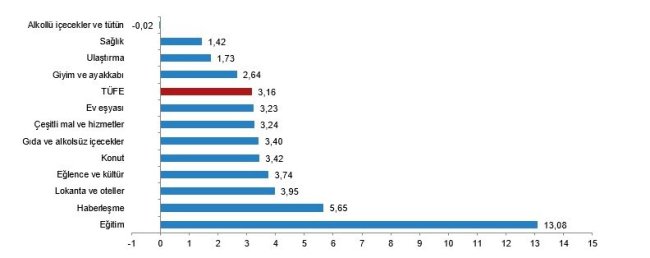 Bir önceki yılın aynı ayına göre en az artış gösteren ana grup %50,10 ile giyim ve ayakkabı oldu. Buna karşılık, bir önceki yılın aynı ayına göre artışın en yüksek olduğu ana grup ise %104,07 ile eğitim oldu.