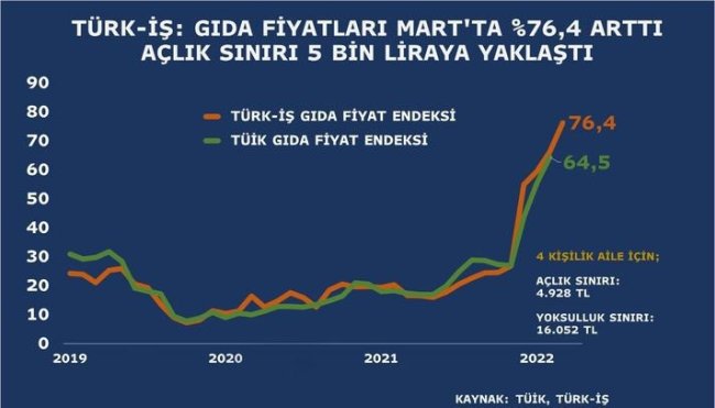 Türk-İş'in çalışmasına göre Mart ayında gıda enflasyonu rekor düzeye çıktı. Verilere göre gıda fiyatları aylık bazda %8,24, yıllık %76,39 arttı. Çalışmaya göre Mart ayı itibariyle yoksulluk sınırı 16 bin 52 TL, açlık sınırı ise 4 bin 928 TL oldu. Bekâr bir çalışanın "yaşama maliyeti" ise aylık 6 bin 473 TL’ye yükseldi. Bu ay asgari ücretle çalışan bir bekârın açlık sınırı ise 2 bin 220 TL olarak kaydedildi.