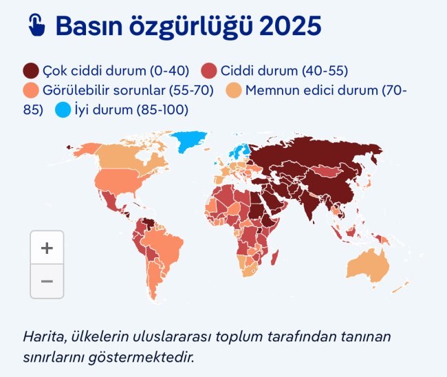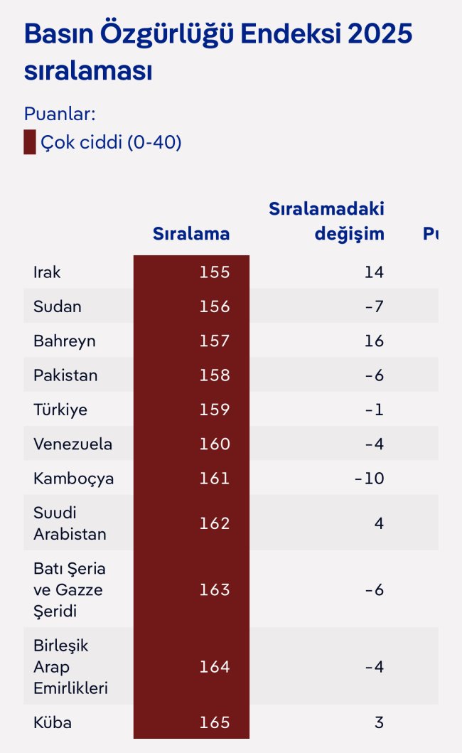 Uluslararası Sınır Tanımayan Gazeteciler (RSF) örgütünün yayımladığı 2025 Dünya Basın Özgürlüğü Endeksi'ne göre Türkiye, basın özgürlüğü konusunda geçen yıla kıyasla bir basamak daha gerileyerek 180 ülke arasında 159'uncu sıraya düştü. Türkiye, geçen yıl diğer ülkelerdeki daha büyük gerilemeler nedeniyle göreceli olarak yedi sıra yükselmişti. Ancak 2025'te ulusal düzeydeki olumsuz şartlar nedeniyle yeniden düşüş yaşadı ve "çok vahim" kategorisinde kaldı. Türkiye'nin hemen önünde Pakistan (158), Bahreyn (157), Sudan (156) ve Irak (155) gibi ülkeler bulunurken, gerisinde ise Venezuela (160), Kamboçya (161), Suudi Arabistan (162) ve Filistin (163) yer alıyor.