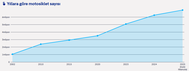 Türkiye'de trafikteki motosiklet sayısı son 20 yılda sürekli artıyor. 2025 Eylül itibarıyla trafiğe kayıtlı 6 milyon 946 bin 540 motosiklet var ve trafiğe kayıtlı toplam araç sayısında motosikletler %20'yi oluşturuyor. Son 5 yılda motosikletli kaza sayısı %170 arttı.
