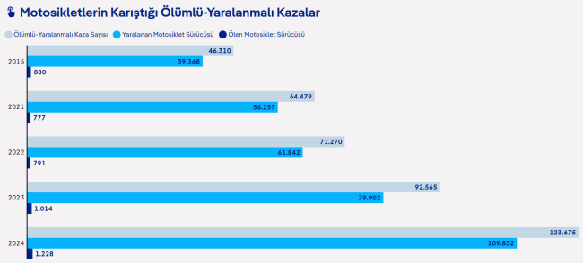 TÜİK verilerine göre motosikletlerin dahil olduğu ölümlü ve yaralanmalı kazalarson yıllarda motosiklet sayısındaki artışın üzerinde bir hızla yükseliyor: 2021'de motosikletlerin karıştığı ölümlü-yaralanmalı kaza sayısı 64 bin 479 iken 2022'de 71 bin 270'e, 2023'te 92 bin 565'e, 2024'te ise 123 bin 675'e çıktı. Böylece dört yılda kazaya karışan motosiklet sayısı neredeyse iki katına yükselmiş oldu. Daha uzun dönemli veriler de benzer bir eğilimi gösteriyor. 2015'te motosikletlerin karıştığı ölümlü-yaralanmalı kaza sayısı 46 bin 310'du. Bu sayı 2024'te 123 bin 675'e çıktı; artış oranı yaklaşık %167 oldu. Aynı dönemde yaralanan motosiklet sürücüsü sayısı 39 bin 368'den 109 bin 832'ye yükseldi. Yaralanmalardaki artış oranı ölüm artışından da daha yüksek gerçekleşti.